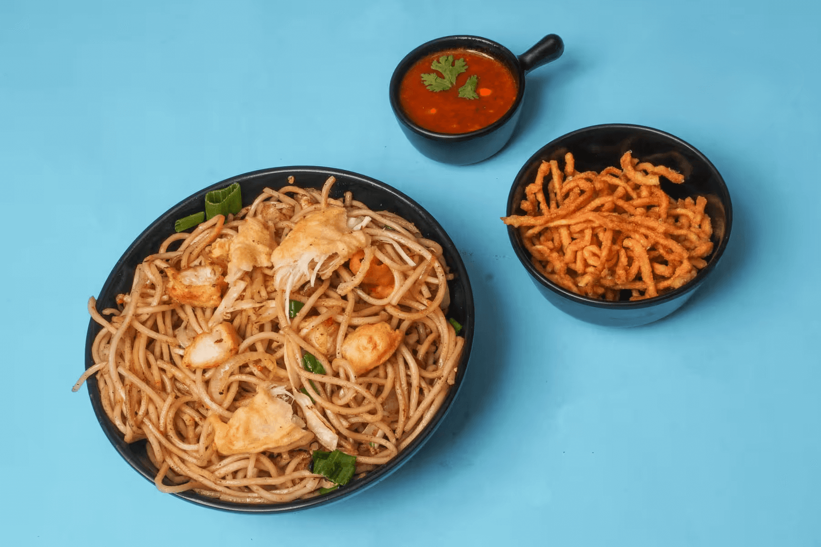 Chicken Hakka noodles is a popular Indo-Chinese dish featuring stir-fried boiled noodles, tender chicken, and a colorful mix of vegetables like bell peppers, carrots, and cabbage.